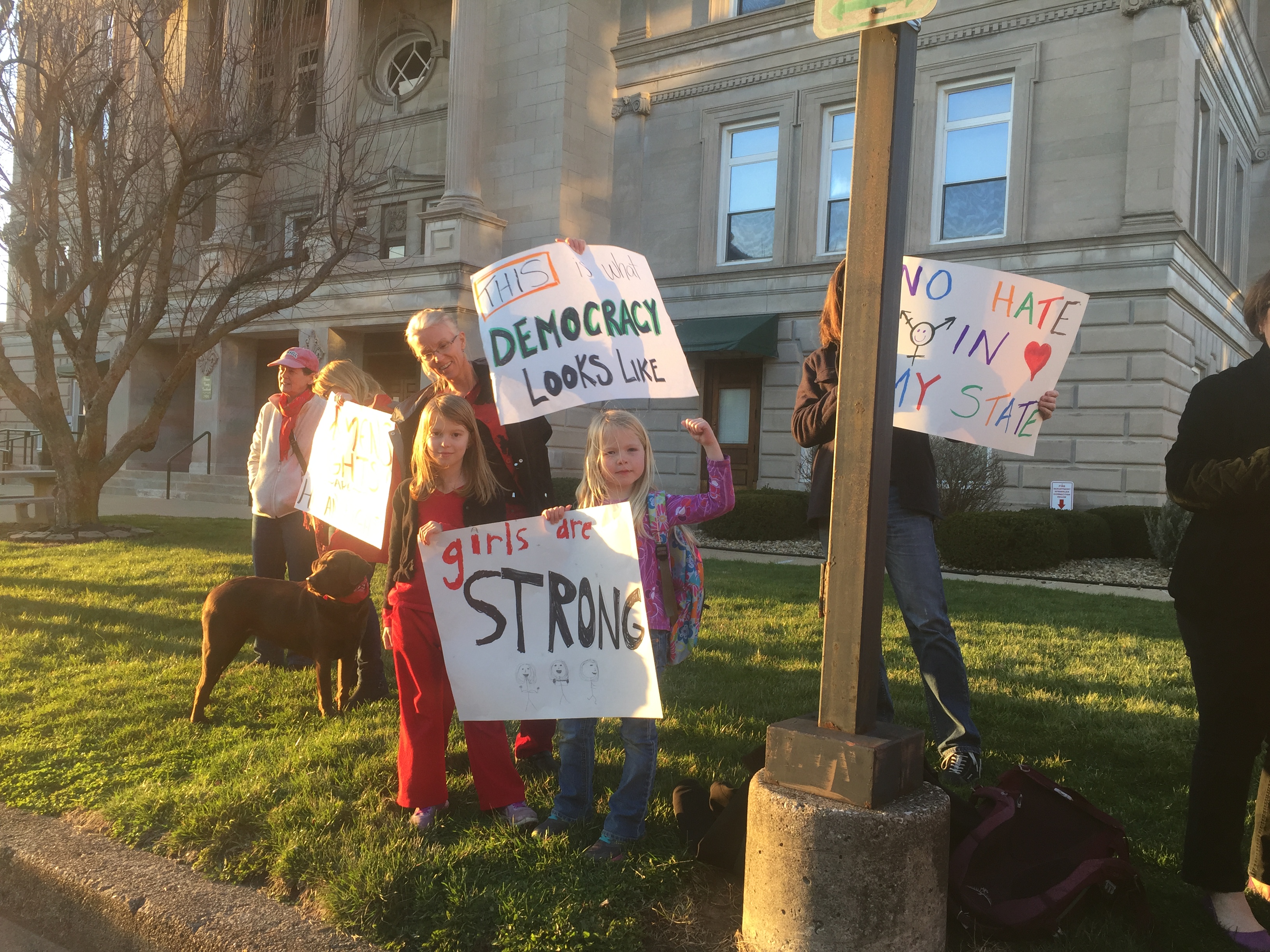 Before standing outside the courthouse, people met at Conspire, a shop owned by J.D. Grove dedicated to regional and local art, to make the signs for the demonstration. Grove is a member of Rise Up Greencastle and said that they were there to support diversity and human rights.