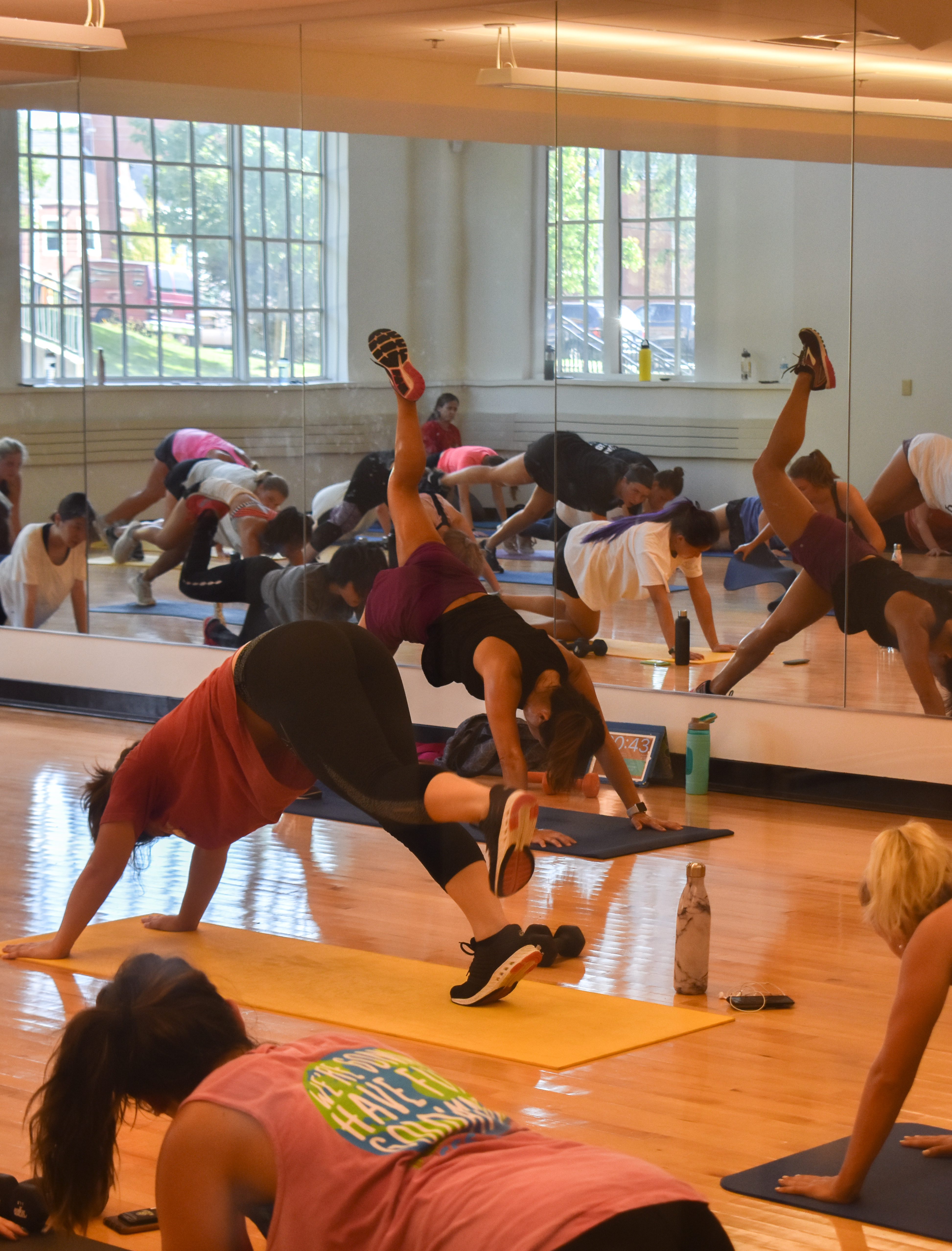 At 4:30 p.m. every Tuesday and Thursday, a beeping sound echoes in Lilly Fitness Center Room 1025 and high tempo music fills the space as people start to bounce along to the beat. Sweat runs down their bodies and drops onto the floor.