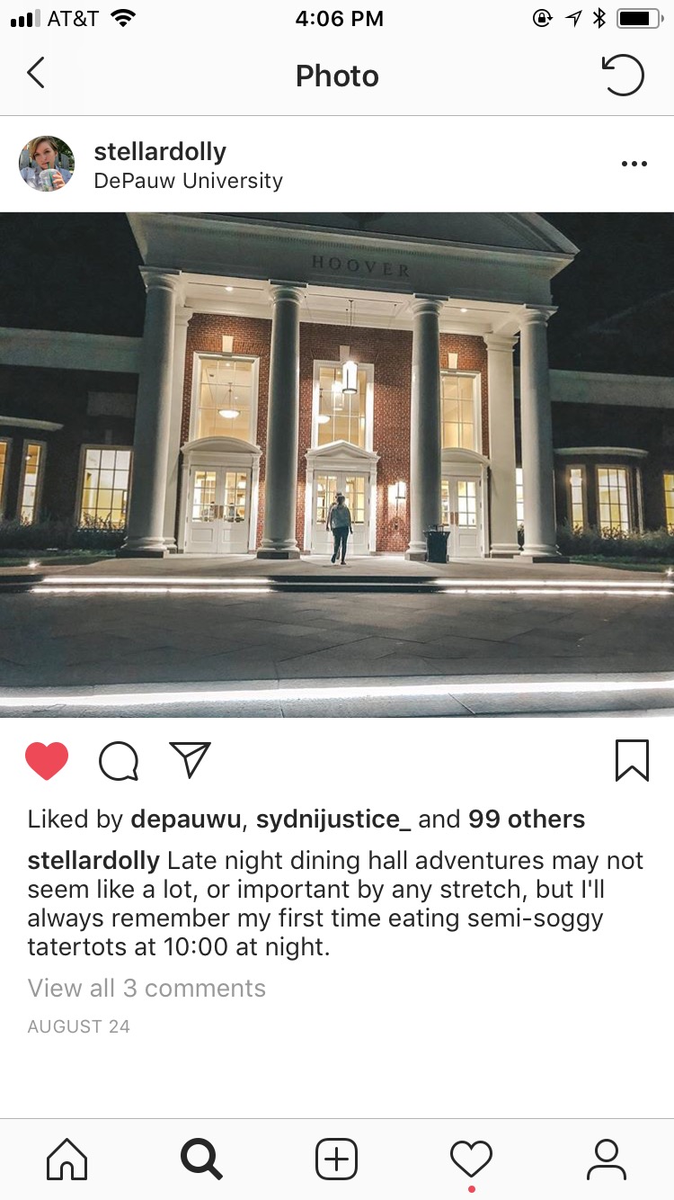 S: I like a lot of my newer posts since I’ve been on campus, because when you’re just in the same place all the time you run out of stuff to take pictures of, so being on campus has given me a lot of inspiration and new things to take pictures of. This picture I took the first night I went to late night at Hoover is one of my favorites, because I think this area is just so beautiful when it’s all lit up and it was just such a fun night. Also a picture I took of the fountains outside Hoover got reposted by the DePauw Instagram so that was cool.