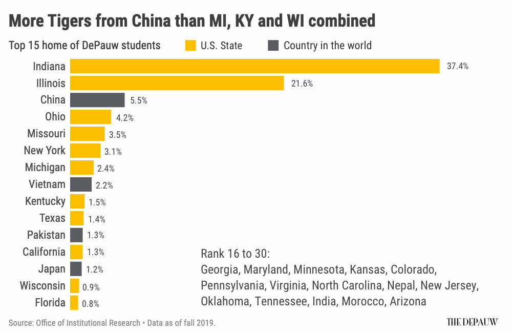 International students make up 13% of the DePauw student body, with China alone coming in third for student population - after Indiana and Illinois and greater than Ohio and Missouri. Yet the Marketing and Communications Department spends zero dollars on global advertisement.