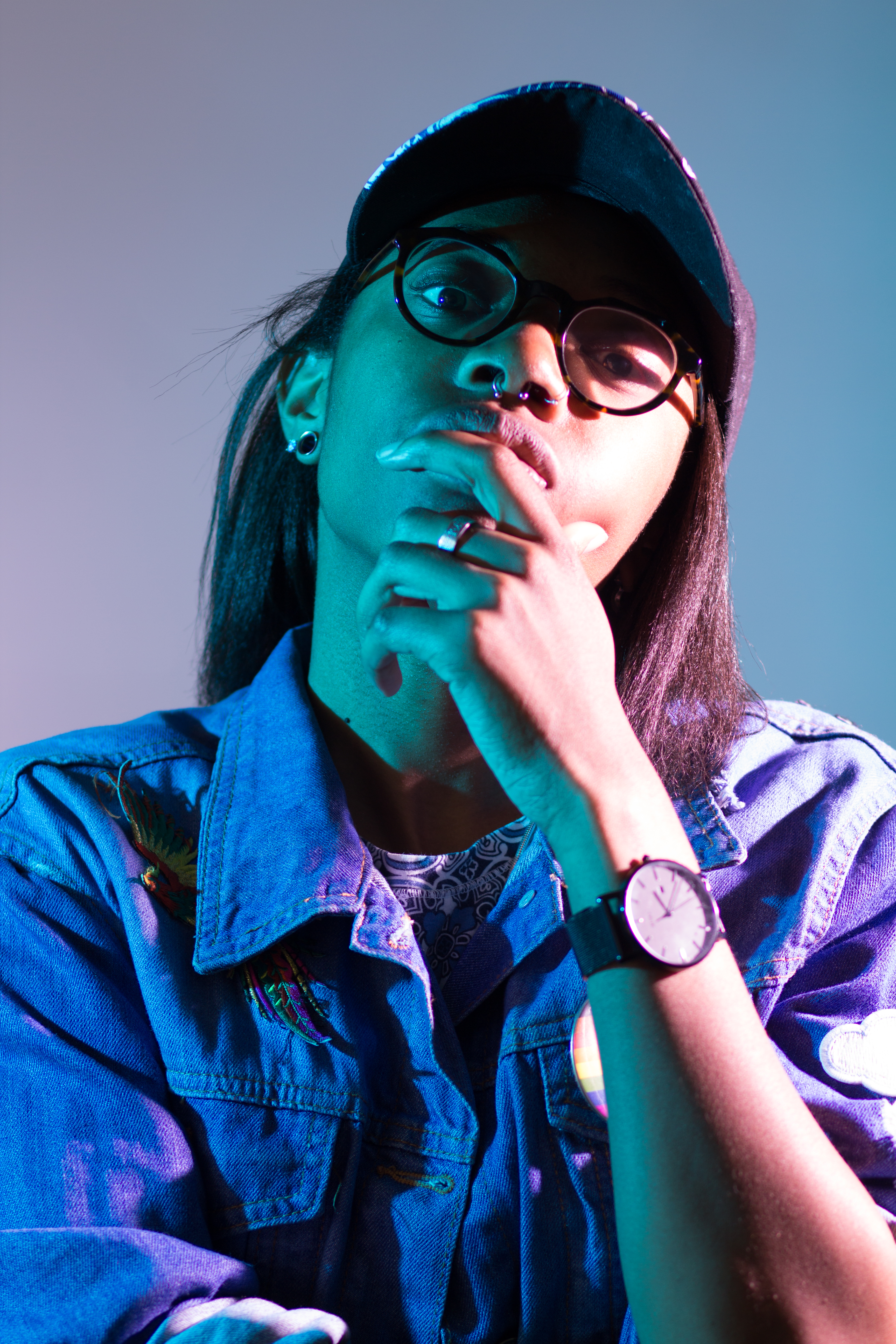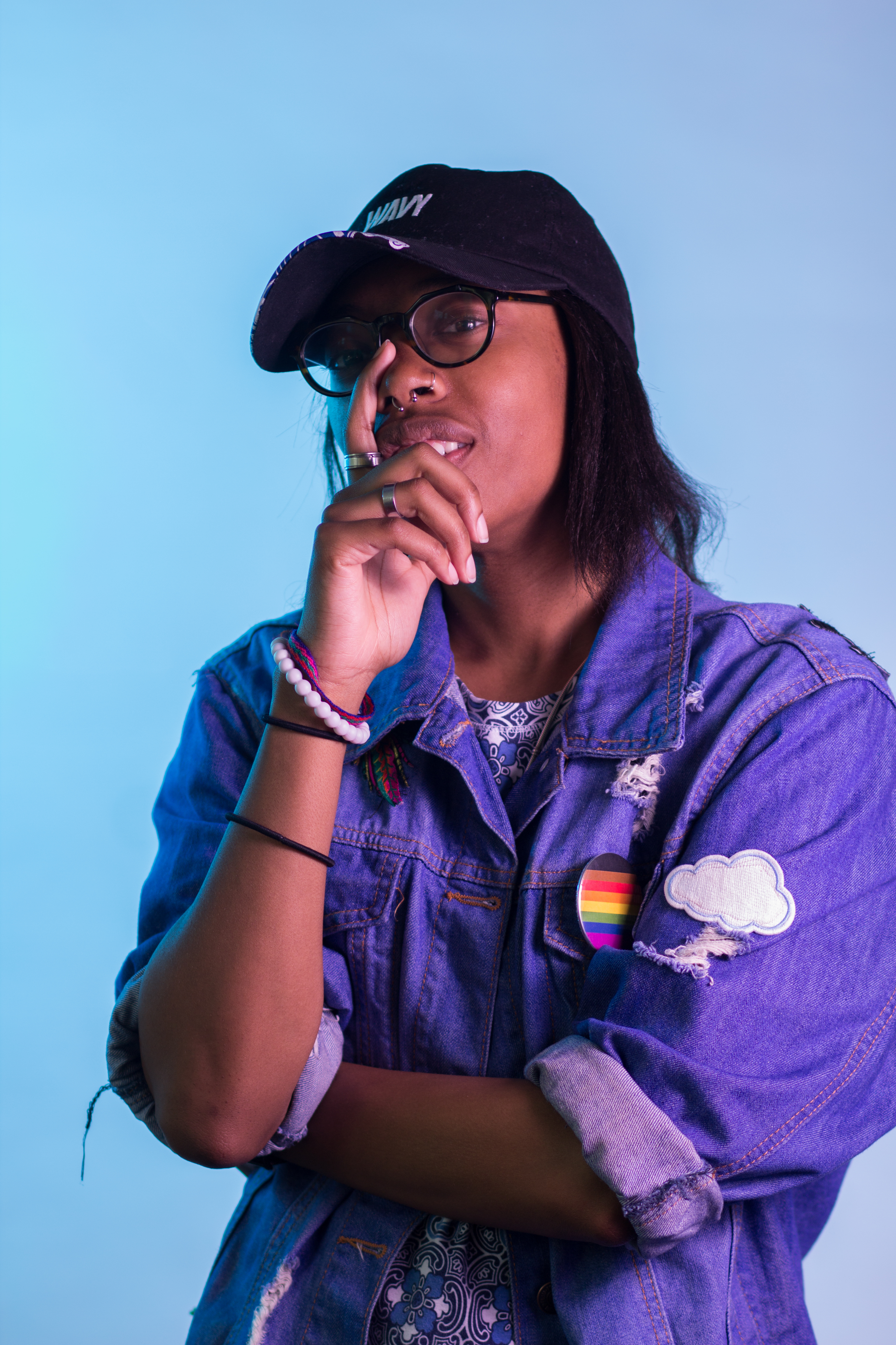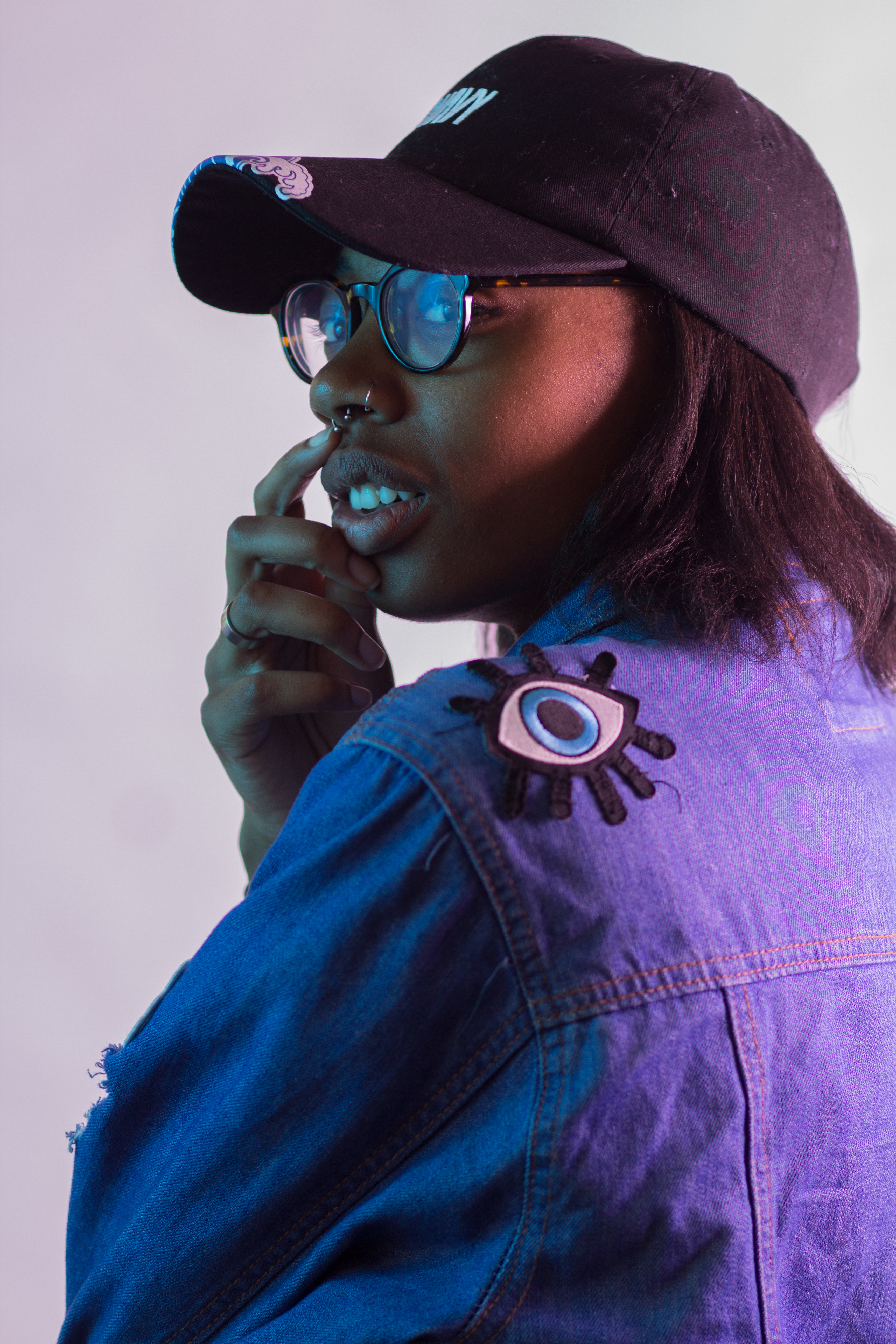 JH: I got it from Forever 21. It was just a basic ripped denim jacket, and I was like ”yo I can freak this.” So I got patches from Amazon. They were like two bucks and a dollar. And just cool stuff. So an eye on the back; just the concept like “watching your back.” The cloud is kind of like just a play on the rip. To make it look like precipitation, like a raincloud. And patches like a rainbow flag for my identity with an Audre Lorde quote. And a phoenix ‘cause that’s my sorority name- my Zeta name- and then a white rose ‘cause that’s also for my sorority: that’s our symbol. Things that are a part of me. Things I like.