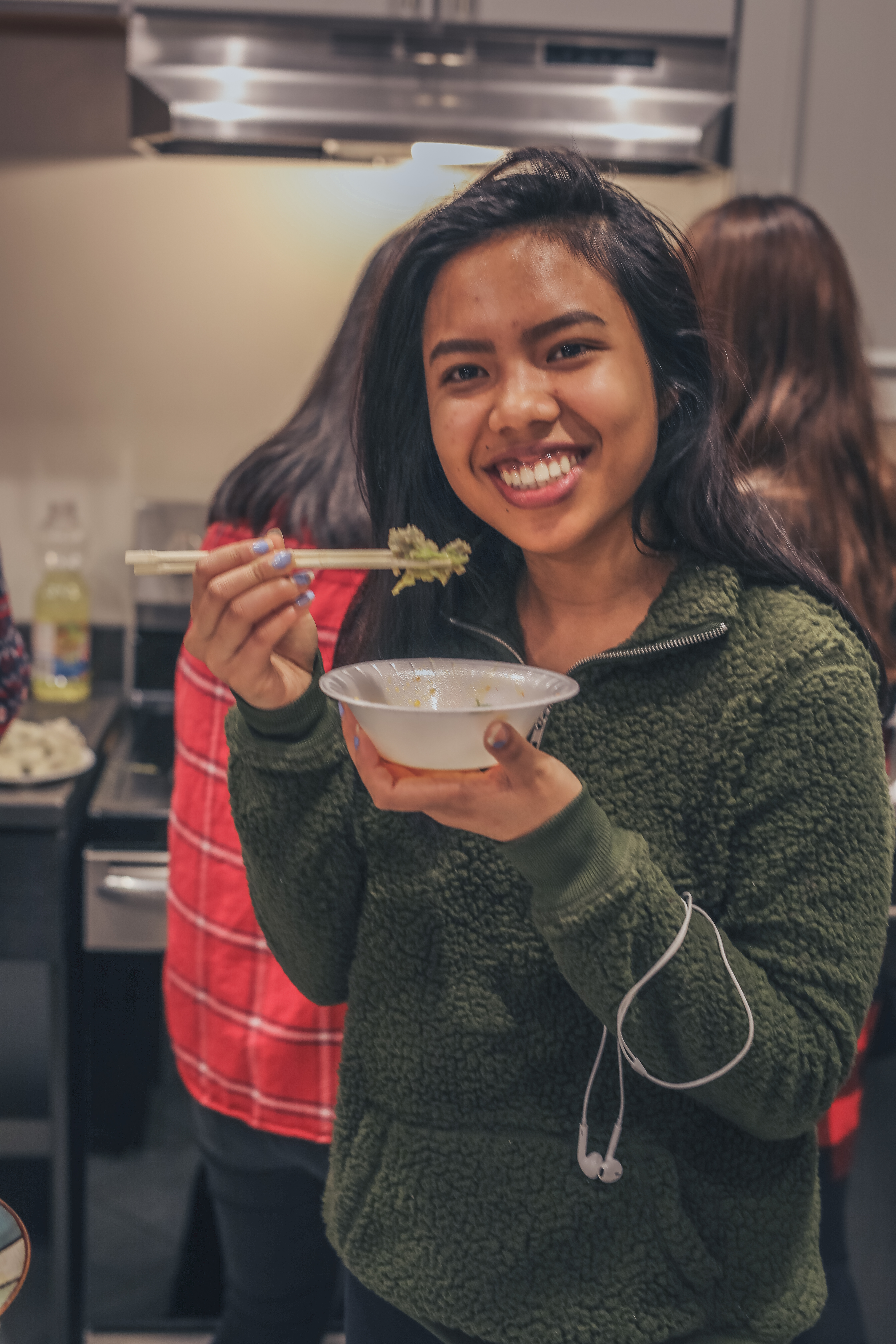 Sophomore Diane Um was busy in the kitchen making Tteokbokki, or spicy fried rice cakes. Um, as a student from Korea and vice president of ISA, took the role after a request from the organizer. “DCC worked so hard for everyone to feel inclusive,” Um said. “I am glad to have this opportunity to cook one of my favorite Korean foods here.”