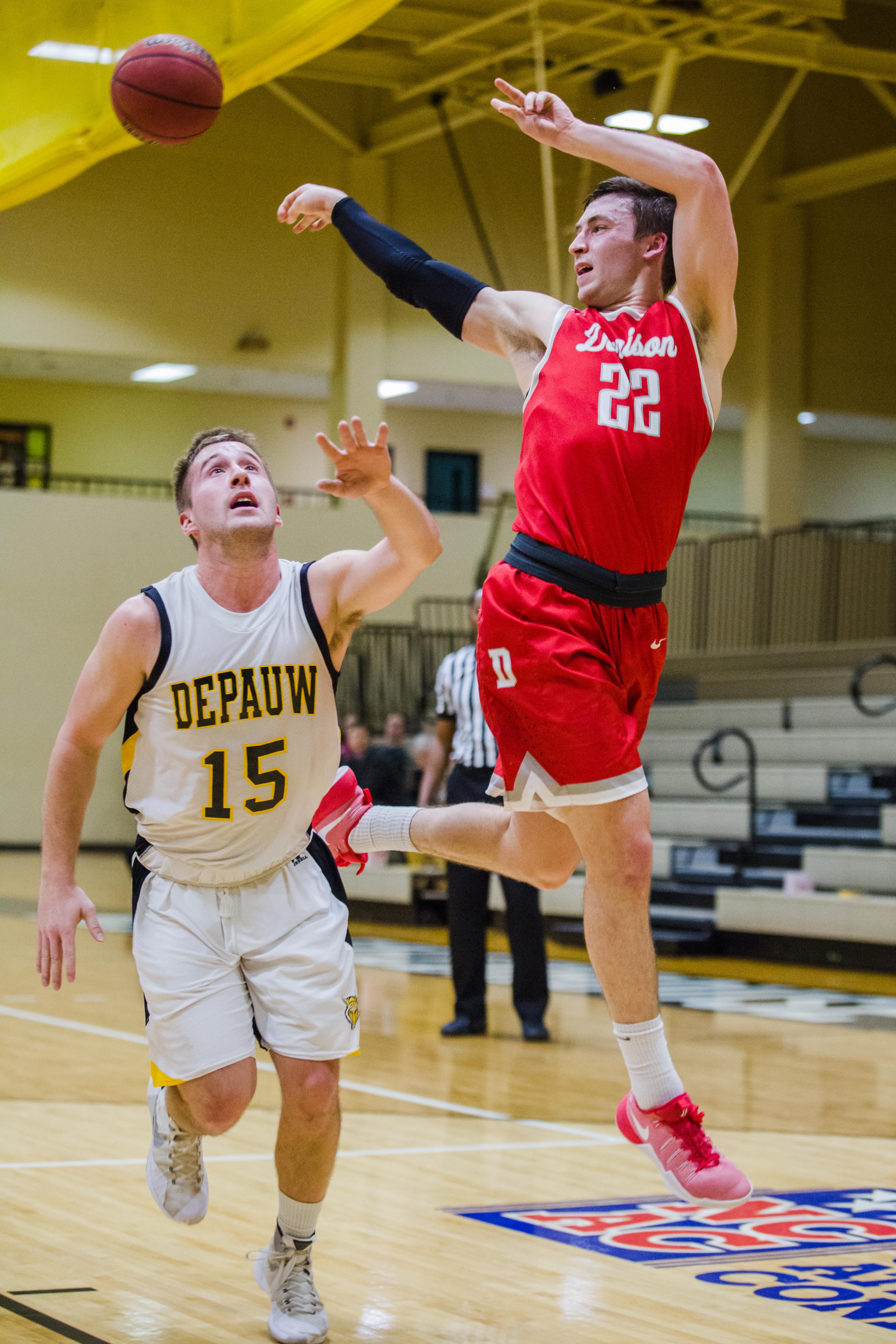 The team struggled in the first half defensively and fell to a quick 22-16 deficit after a Kenyon layup. With 3:12 left to go in the half, DePauw held their biggest deficit of the game at 36-25 after two made free throws by Kenyon.