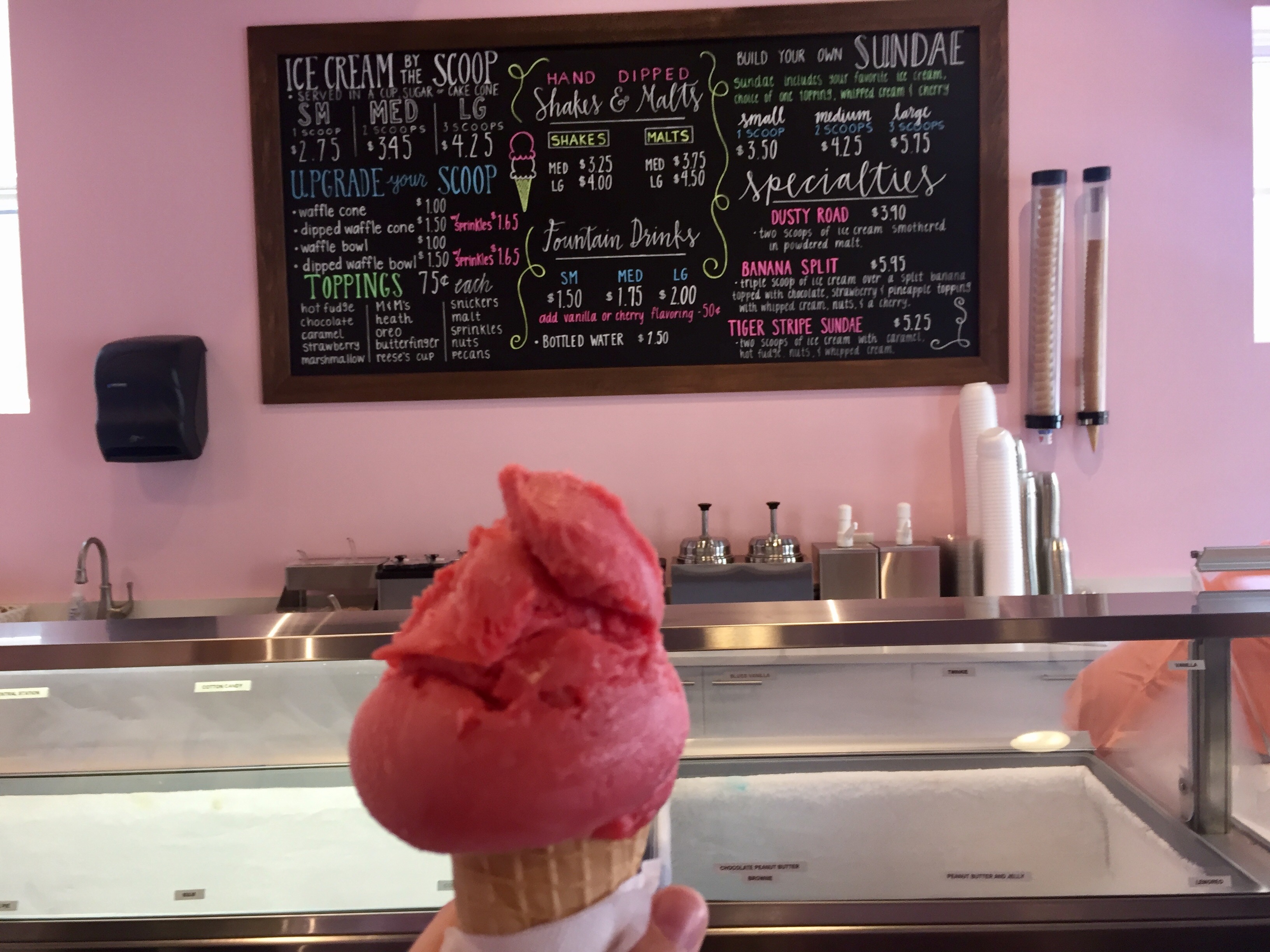 The pink walls and white trim are, in the words of owner Joan Earl, reminiscent of “a strawberry ice cream cone”. The wall color is fitting, as Scoops serves both cotton candy and strawberry ice cream flavors. She and her family, including her two sisters and her young niece, picked out all the decor and hand-drew the signs to give it the special flair they hope is endearing to customers.