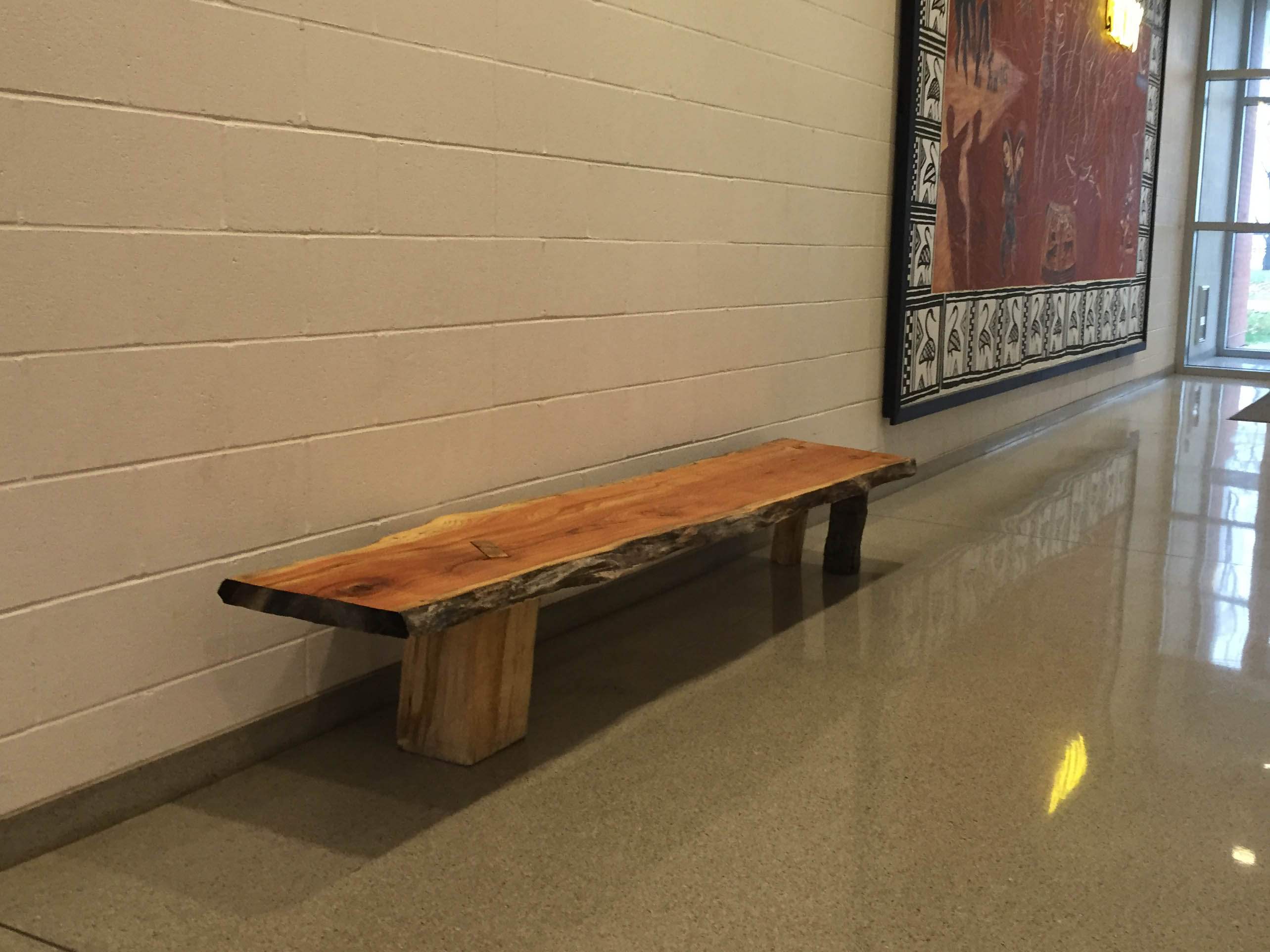 Thirteen benches were created by students during the weekend workshop. These benches have continued to dry since last fall and will be distributed throughout the trails and in the sculpture part of the nature park. One finished bench currently sits in the hallway outside of the Peeler Auditorium.